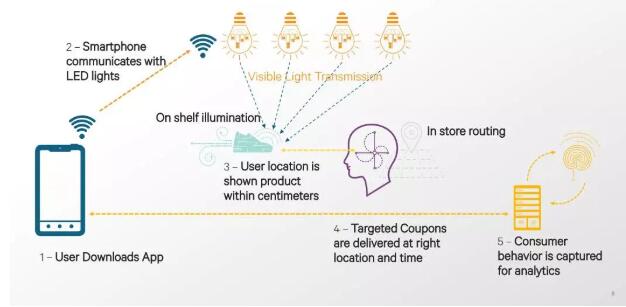 目前,可見光技術(shù)在北美有很多商場已經(jīng)在部署。用戶下載應(yīng)用后,到達(dá)商場里的某一個(gè)貨架,通過檢測貨架周圍的燈光即可知曉具體位置,商家在通過這樣的方法向消費(fèi)者推動商品的折扣等信息。