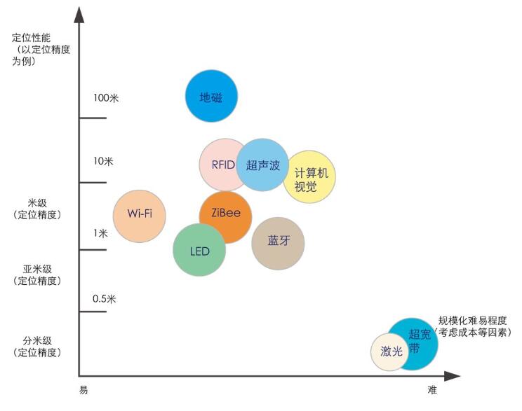 室內(nèi)定位的技術(shù)分支多樣,下圖是各種室內(nèi)定位方案的對比圖: