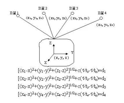 當(dāng)GPS衛(wèi)星正常工作時(shí),會不斷地用1和0二進(jìn)制碼元組成的偽隨機(jī)碼(簡稱偽碼)發(fā)射導(dǎo)航電文。導(dǎo)航電文包括衛(wèi)星星歷、工作狀況、時(shí)鐘改正、電離層時(shí)延修正、大氣折射修正等信息。然而,由于用戶接受機(jī)使用的時(shí)鐘與衛(wèi)星星載時(shí)鐘不可能總是同步,所以除了用戶的三維坐標(biāo)x、y、z外,還要引進(jìn)一個(gè)變量 t 即衛(wèi)星與接收機(jī)之間的時(shí)間差作為未知數(shù),然后用4個(gè)方程將這4個(gè)未知數(shù)解出來。所以如果想知道接收機(jī)所處的位置,至少要能接收到4個(gè)衛(wèi)星的信號。如下圖所示: