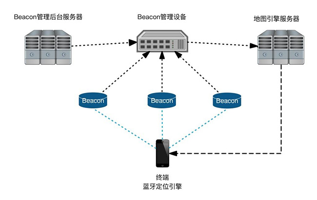 網(wǎng)絡(luò)側(cè)定位系統(tǒng)由終端(手機(jī)等帶低功耗藍(lán)牙的終端)、藍(lán)牙beacon節(jié)點(diǎn),藍(lán)牙網(wǎng)關(guān),無線局域網(wǎng)及后端數(shù)據(jù)服務(wù)器構(gòu)成。其具體定位過程是: