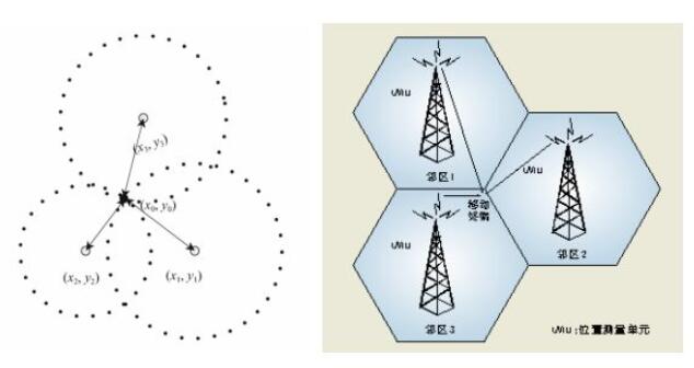 該方法同樣是測量信號到達(dá)時(shí)間,但使用到達(dá)時(shí)間差進(jìn)行定位計(jì)算,可利用雙曲線交點(diǎn)確定移動臺位置,故可以避免對基站和移動臺的精確同步。 |