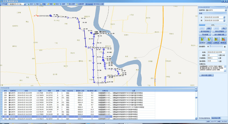 系統(tǒng)可以按設(shè)置的時(shí)間段在電子地圖上直觀再現(xiàn)車輛運(yùn)行的路線,管理者可以設(shè)定軌跡回放的速度和回放的間隔,可以暫?;蛲V管壽E回放。鼠標(biāo)指向任意軌跡點(diǎn),系統(tǒng)會(huì)顯示該軌跡點(diǎn)的時(shí)間、速度、方向等歷史數(shù)據(jù),為車輛的管理提供了管理依據(jù)。